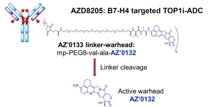 AZD8205是一款B7-H4靶向ADC,新型拓扑异构酶1抑制剂(TOP1i)—linker—靶向B7-H4的抗体组成。它的作用机制是TOP1i弹头递送至B7-H导致4阳性细胞DNA受伤和细胞死亡。